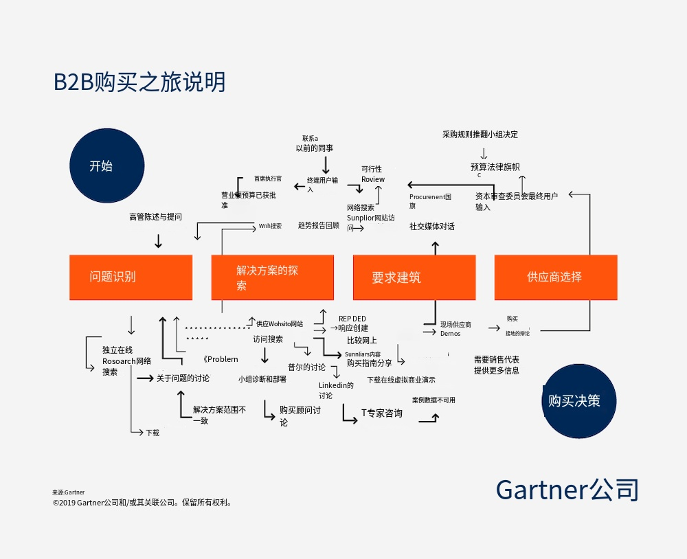 嗯,客户旅程可能会变得异常复杂,尤其是在B2B/SaaS领域。只需看看Gartner的客户旅程示例即可: