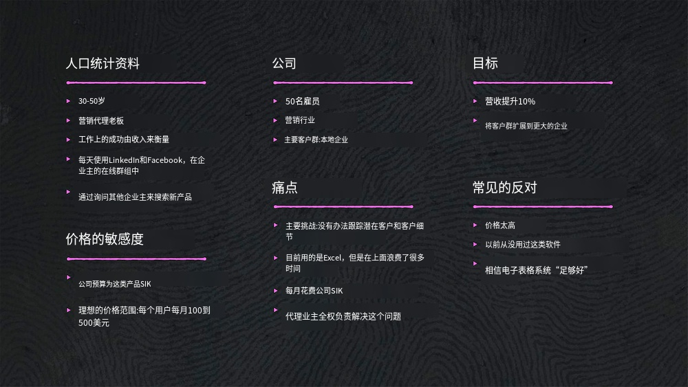 尽管这些买家角色是虚构的,但它们代表了将从您的产品或服务中受益的公司类型,并概述了您应该使用哪些销售方法将他们转变为可行的潜在客户。这应该基于过去客户的真实数据,包括人口统计、目标、挑战和痛点等详细信息。